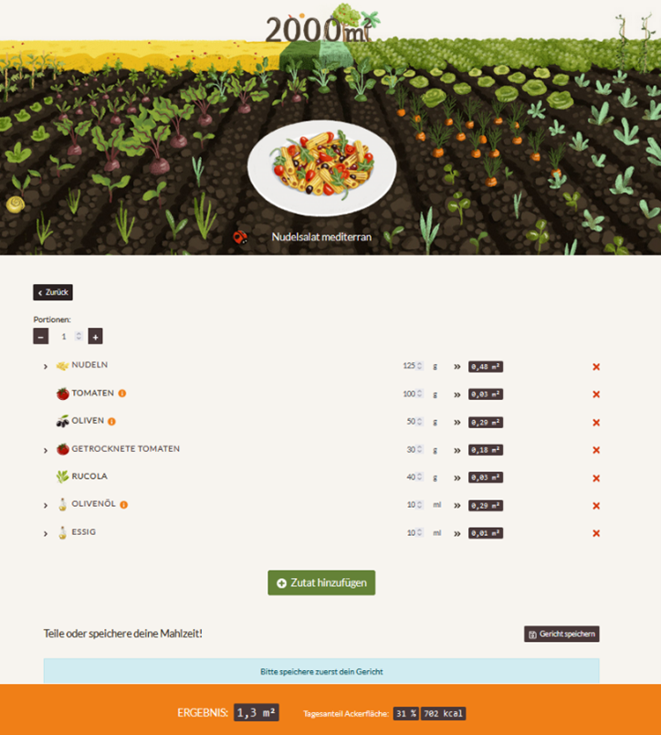 Die KollegInnen der Zukunftsstiftung Landwirtschaft haben sich die Arbeit gemacht und einen Flächen-Rechner kreiert, den ihr Online nutzen könnt. Hier findet ihr vorkalkulierte Standartgerichte (inkl. Döner-Kebab und Eierkuchen mit Apfelmuss) und habt die Option selbst ein Rezept einzugeben.
